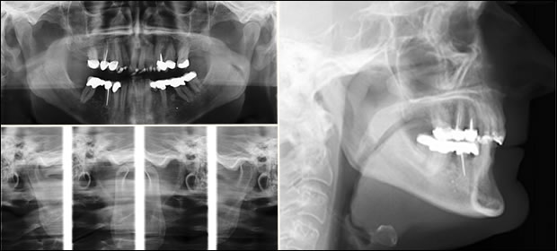 Fig 6: Diagnostic images for this case included a panoramic image, trancranial images of the temporo-mandibular joints in the closed and open positions, as well as a cephlometric image.