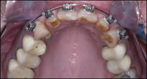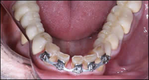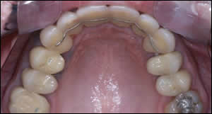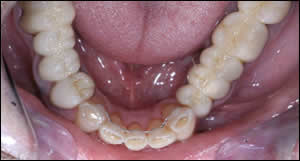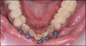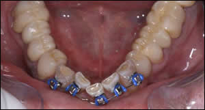 Fig 11: Total treatment time was 3 months for the maxillary teeth. Splinted interim acrylic crowns were placed on the maxillary anterior teeth to achieve golden proportions...and to provide retention. Treatment time was 6 months for the mandibular teeth. The alignment of the mandibular anterior teeth allowed for the proper contour and sagital position of the upper incisors. A normal overbite/overjet relationship was established. A bonded lingual retainer was placed on the lower anterior teeth.