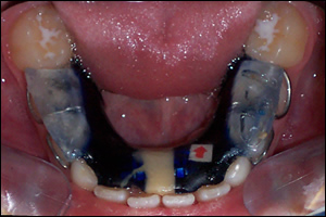 Fig 3: Upon complettion of Twin Block therapy, a Class I molar and skeletal relationship was established. The deep bite was reduced. The spaces between the upper and lower posterior teeth will allow for eruption of the permanent bicuspids.