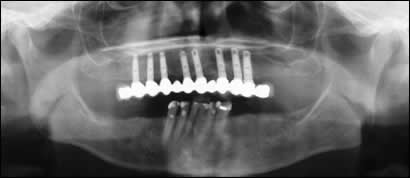 Fig 6: The post-operative radiograph reveals the successful integration of eight dental implants and the 12 unit porcelain bridge.