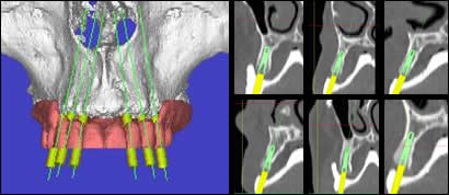 Fig 3: Utilizing a 3-dimensional DentaScan, Simplant software and Atlantis CAD/CAM technology, we were able to perform a “virtual” operation, placing 6 dental implants in the maxillae.