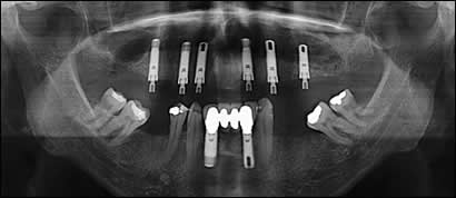 Fig 4: The 6 dental implants were placed “non-surgically”, that is, no incisions, flaps or sutures were required. There was practically no bleeding and minimal post-operative discomfort. The implants were loaded the same day with a fixed acrylic bridge.