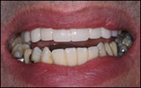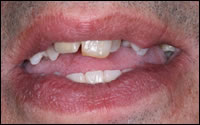 Fig 1: A 63 year old male presented with several missing teeth. The narrow and asymmetrical palate was an obstacle to several prosthetic options. A fixed porcelain bridge supported by dental implants was eventually chosen to restore form and function to the upper dental arch.