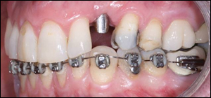 Fig 2: Braces were placed on the lower cuspid in an attempt to intrude it. Intruding a lower cuspid is difficult to do because of the inherently long root on lower cuspids and the dense bone of the mandible